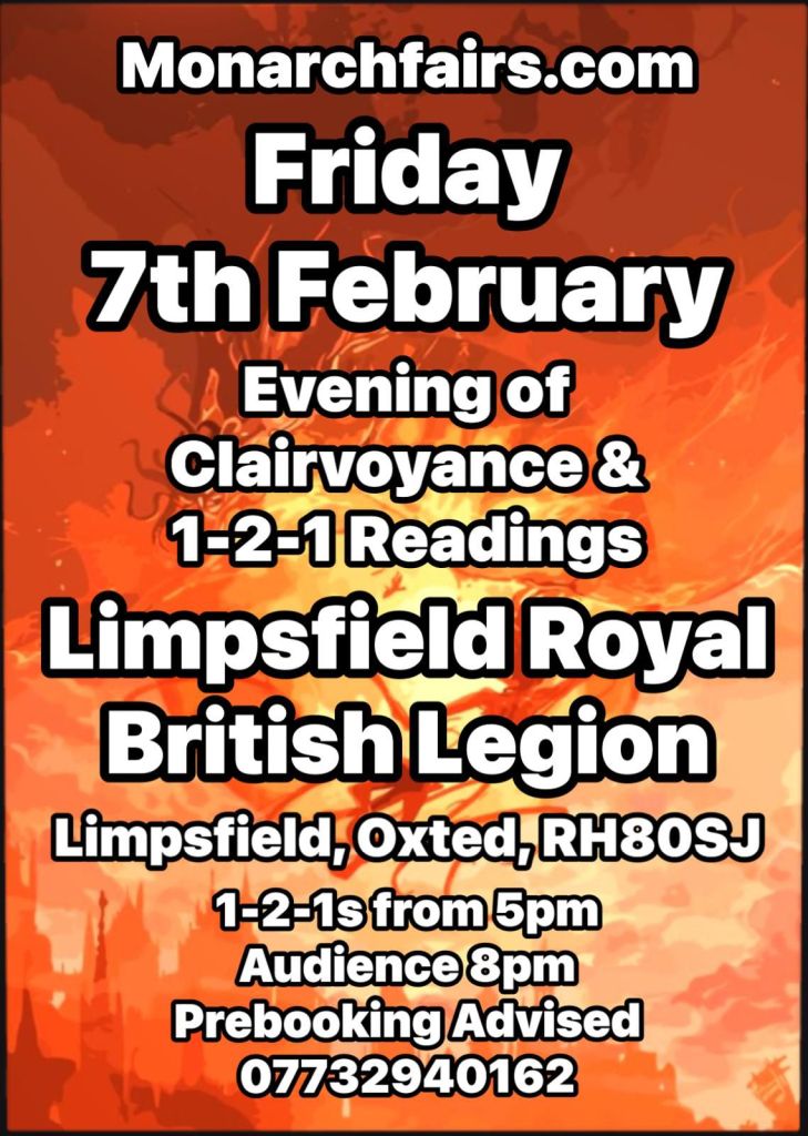 - What does your future hold? We predict you’ll have a great time on Friday 7th February, as we’re hosting another evening of Clairvoyance with Monarch Fairs. Featuring 1-2-1 readings (please book in advance) from 5pm and audience event at 8pm. Prebook 1-2-1s via 07732 940162.